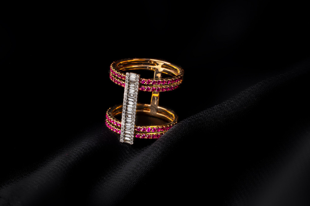 خاتم ذهب اصفر عيار 18 مرصع بألماس الباقيت الأبيض والحجر الروبي