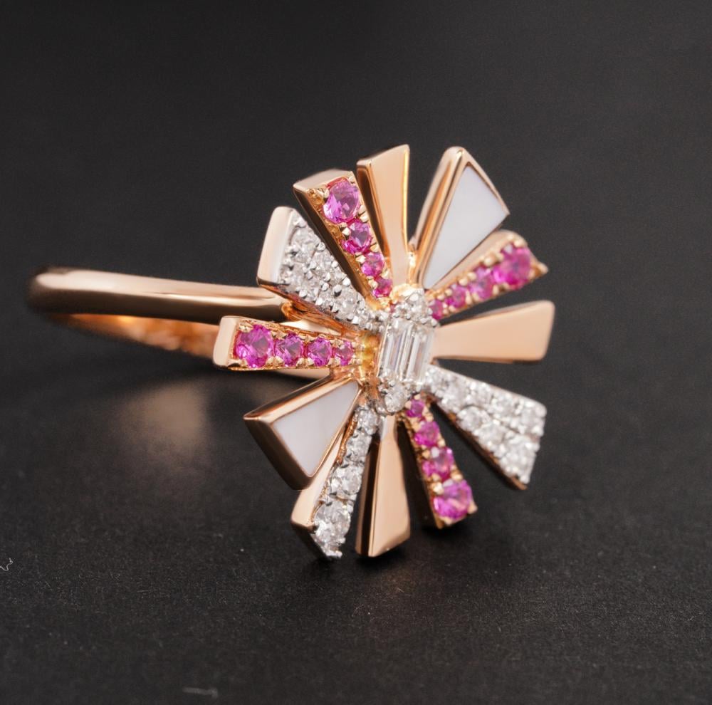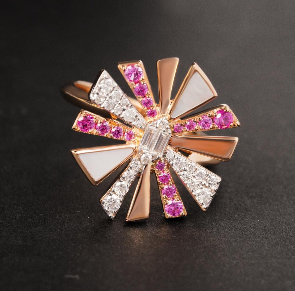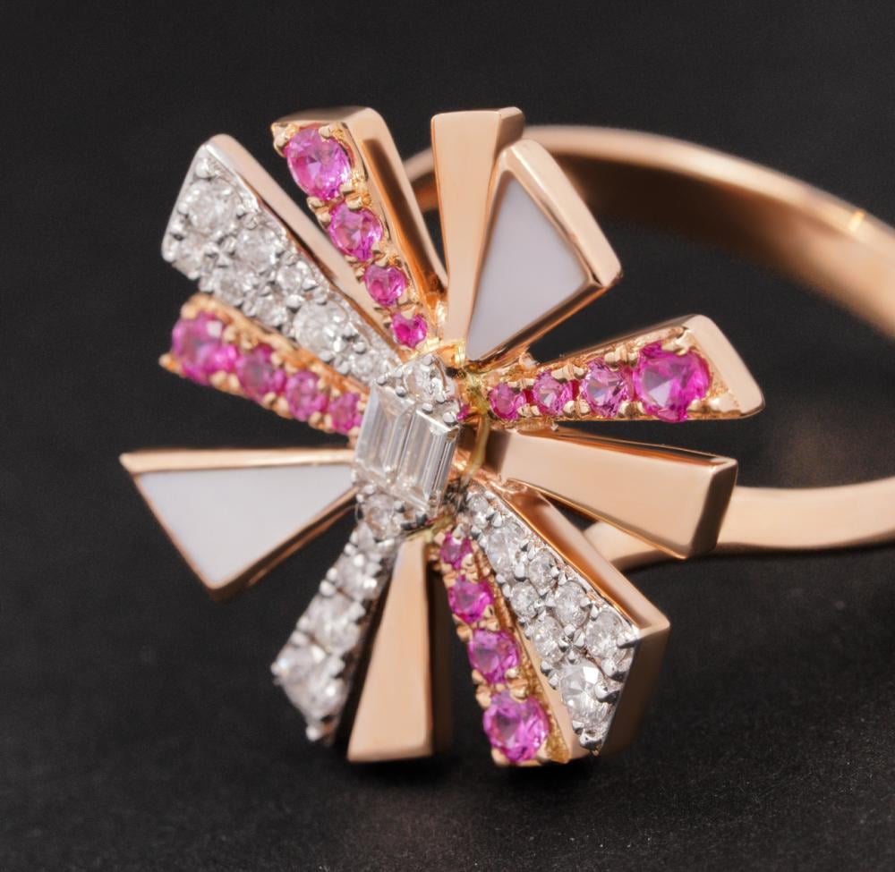 خاتم ذهب عيار 18 مزين بالألماس الأبيض والأحجار الكريمة